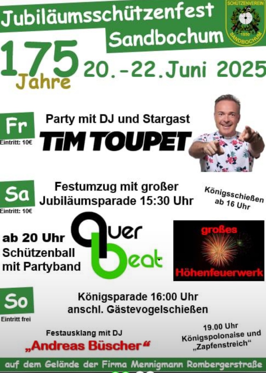 Auf Einladung des Schützenvereins Sandbochum, der am Wochenende vom 20. bis 22 Juni sein 175-jährigem Jubelfest und unseres befreundeten Spielmannszuges Sandbochum machten sich die Garde Grenadiere und eine Abordnung der Bollerborn Kompanie am Samstag, den 21. Juni mit dem Bus auf dem Weg in Richtung Hamm. Am Steuer unser Ehrenadjutant und König aus dem Jahr 2007, Friedhelm Stupeler, der uns gewohnt sicher und pünktlich an das Ziel und gegen 20 Uhr auch wieder zurück nach Altenbeken brachte. Dafür ihm ein herzliches Dankeschön.