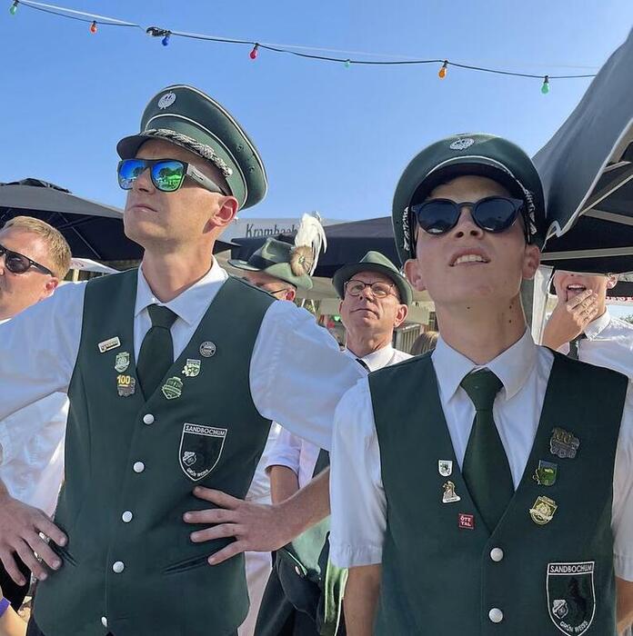 Die Musiker/innen der Garde Grenadiere hatten derweil auf dem Festplatz unter Sonnenschirmen Platz genommen, um noch einige Musikstücke zum Besten geben zu können. Der Tambourmajor des Spielmannszuges Sandbochum, Heinz Wilhelm Kraß, nutze die Gelegenheit, einmal bei den Garde Grenadieren aus Altenbeken den Takt vorzugeben.