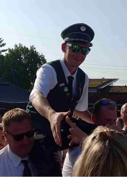 Draußen auf dem Festplatz befand sich zu dieser Zeit das Vogelschießen in seiner letzten und spannenden Phase. Auch zwei Musiker des Spielmannszuges Sandbochum beteiligten sich am Schießen und letztendlich gelang es Jan Biermann mit einem letzten gezielten Schuss um ca. 18.45 Uhr die letzten Reste des Vogels aus dem Kugelfang zu holen. Herzlichen Glückwunsch an den Jubelkönig, der mit seinem Treffer den gesamten Spielmannszug Sandbochum zum Jubeln brachte.