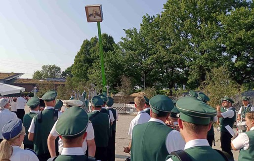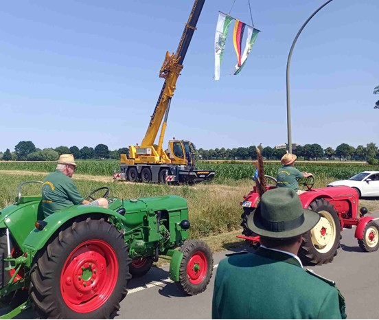 Vor dem Zugang zum Festplatz hatten sich alle Königspaare und ihre Hofstaate zur Parade aufgestellt. Die Schützen und Musiker/innen drehten deshalb eine Extrarunde, um den Majestäten eine besondere Ehre mit dem Vorbeimarsch erweisen zu können. Die Fahnen am Kran wiesen auf das Festgelände hin und die beiden Traktoren sicherten ein letztes Mal die Zufahrtsstraßen.