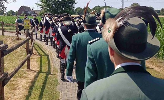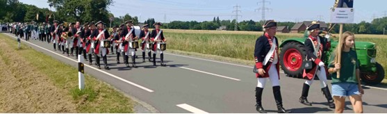 Der Weg zum Treffpunkt mit den anderen Schützenvereinen führte bei strahlendem Sonnenschein und jetzt doch Temperaturen über 30 Grad Celsius an Wiesen und Feldern aber auch festlich geschmückten Häusern vorbei, vor denen immer wieder Zuschauer/innen den Königspaaren, Schützen und Musikkapellen zujubelten.