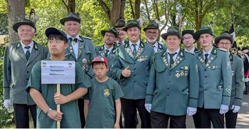 Als wir zum Glück eine kurze Pause im Schatten der Bäume einlegen konnten, nutzten wir die Gelegenheit ein Gruppenfoto zu machen. Zwei Kinder aus Sandbochum trugen während des Festumzuges unser Schild „Bollerborn Kompanie“.