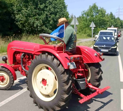 Der gut 1,5 km lange Marsch, der u.a. auch über eine Bundesstraße in der Nähe der Autobahnauffahrt zur A1 führte, wurde von Treckerfreunden auf ihren historischen und sehr gut restaurierten Gefährten gesichert.
