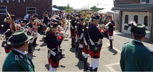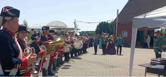 Kurz nach 10.30 Uhr starteten wir von der Eggelandhalle über die B64 und B1, weiter über die A44 und die A1 zum noch amtierenden Schützenkönig Tim Steckenreuter aus Sandbochum, der die Garde Grenadiere und die Bollerborner zu sich nach Hause eingeladen hatte. Mit Musik ging es nach dem Aussteigen aus dem Bus bei schon knapp unter 30 Grad Celsius die letzten Meter bis zum Wohngebäude, wo die Majestäten mit ihrem Hofstaat und unsere Freunde vom Spielmannszug Sandbochum bereits auf uns warteten.