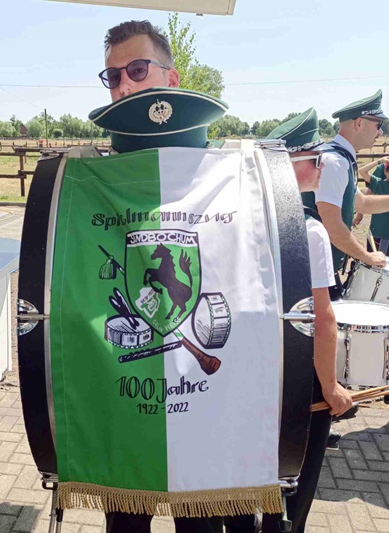 Die Fahne des Spielmannszuges auf der Pauke weist auf das 100jährige Jubiläum des Musikvereines im Jahr 2022 hin, an dem die Bollerborner auch bereits teilnahmen.