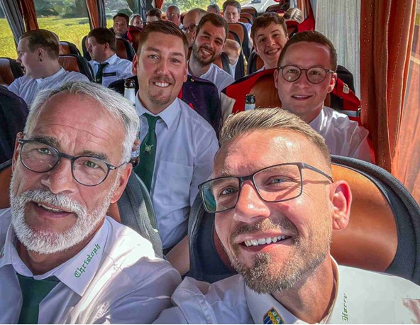 Dann hieß es leider doch Abschied nehmen und der 1. Vorsitzende des Spielmannszuges Frank Großecappenberg (Foto unten) nahm sich die Zeit, die Altenbekener persönlich im Bus zu verabschieden. Er freue sich mit seinen Musikern bereits in vier Wochen in der Eggegemeinde das 275jährigen Jubelfest am Schützenfestmontag mitzufeiern. Man werde versuchen, in Altenbeken zu übernachten und so die Mitternachtsshow live miterleben zu können.